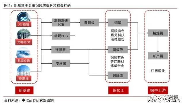 新基建用铜领域及相关标的梳理。对新基建产业链拆分发现,主要涉及铜材需求包括 铜箔、铜板带及线缆等。1)铜箔:主要用于 5G 领域,包括基站建设、5G 手机等方面;2)铜板带:主要用于新能源充电桩、轨道交通及变压器等领域;3)铜线缆:用于特高压 变压器、轨道交通的接触线等领域。新基建带动的各领域快速发展,也能对整个精炼铜消 费带来一定的拉动作用。同时,我们也对产业链用铜环节的相关标的进行详细梳理。