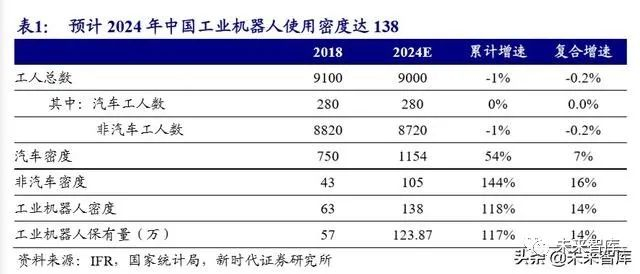 我们预计 2024 年中国工业机器人密度达到 138,非汽车行业达到 105,汽车行 业达到 1154。