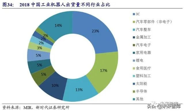 工业机器人主要下游为汽车、3C。2018 年按下游应用划分,汽车占比 35.3%, 其中汽车整车 13.2%,汽车零部件 17.1%,汽车电子 5%,3C 电子占比约为 23.3%(不 含家电)。