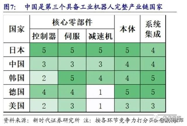 中国是全球第三个具备机器人完整产业链的国家。中国、日本、韩、美、德五 国合计占全球 73%的需求,同时也是主要的工业机器人制造大国。中国具备核心零部件、本体、系统集成的完整产业链。中国和日、韩国都是具备完整产业链的国家。美国和德国缺乏减速器零部件供应商。