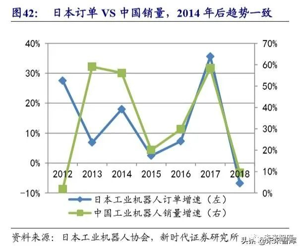 2019Q3-Q4日本工业机器人订单额回暖。日本工业机器人销量占比全球50%, 中国是其最大市场。日本出口到中国工业机器人,从订单到交付大致需 3-6 个月, 因此日本工业机器人订单数据是中国机器人市场 1-2 季度的领先指标。2019Q4 日 本工业机器人订单额降速收窄至-0.3%,产值降速-10%,略有放大。
