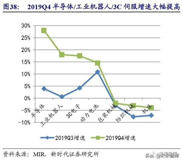 交流伺服是下游各制造业的核心零部件。2019Q3-Q4 华为系 3C 加工设备和半 导体等下游行业需求开始回暖,预期2019Q4-2020Q1苹果系3C设备需求也将回暖,2019Q4 中国交流伺服市场同比增长 10.4%,连续 2 个季度增速回正。