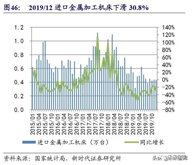2019 年 12 月中国金属成形机床产量同比回正,进口机床增速下滑。2019 年 12 月,中国金属成形机床产量增速回正到 4.8%(11 月增速为 0%), 金属切削机床 产量下滑 14.3%(11 月下滑 13.2%)。另外,2019 年 12 月中国进口金属加工机床下 滑 30.8%,降速有所放大。机床和机器人是自动化的配套设备,12 月机床产量改善, 反映 3C 等制造业的投资复苏预期。