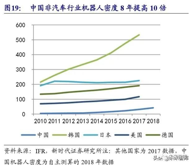 非汽车行业机器人密度目前约为 42,预计 2024 达 105,约 150%的上升空间。2018 年我国非汽车行业机器人密度为 42 台/万人。2013-2018 年 5 年中国非汽车行 业机器人密度从 7 增长到 42,累计增长了 6 倍,年复合增速 44%,假设 2018-2024 年非汽车行业机器人密度增幅下降到 20%,5 年累计增速将达到 2.5 倍,机器人密 度将达 105。韩国、日本、台湾 3C 电子产业发达,自动化程度高,因而机器日使 用密度高。中国除汽车、3C 电子外还有很多其它制造产业,长尾行业密度提升慢 于 3C 电子、汽车行业,中国中期机器人密度将远低于目前日、德的水平,但预计 将达到接近澳大利亚和美国的水平,未来 5 年有望达到约 105。