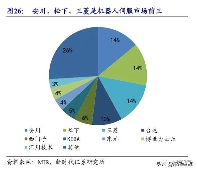 伺服系统四大阵营竞争激烈,国产向上突围难度大。日系品牌凭借良好的产品 性能与极具竞争力的价格垄断了中小型 OEM(设备制造业)市场,以 松下、安川、 三菱为代表;西门子、施耐德、博世等欧美品牌占据高端,下游以大型机械为主;台湾品牌产品价格和技术水平定位于外资品牌和国产品牌之间,以台达及东元为代 表;国产企业以汇川技术、埃斯顿为代表,产品功率范围多在 22KW 以内,技术 路线上与日系产品接近,整体竞争力不断提高。