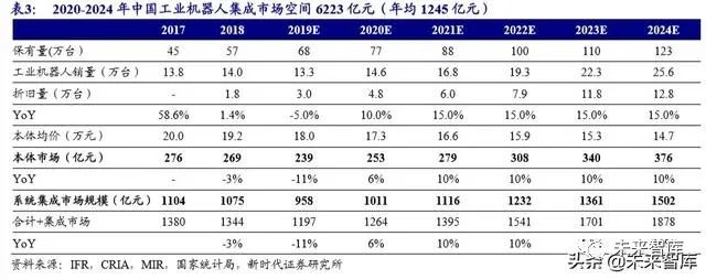预计 2024 年中国工业机器人保有量 124 万台,机器人密度达到 138,预计 2019-2024 年本体销量复合增速 15%,本体与系统集成收入复合增速将达 10%。年 均本体市场 311 亿元,系统集成市场 1245 亿元。