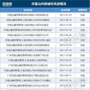 投资界在企查查上搜索“许留山餐饮”,发现共有注册200多家企业,但近150家都处于注销状态。许留山深圳旗下有分支机构41家,目前仅有10家仍在运营。