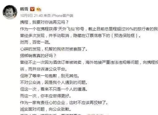 2017年10月9日,韩雪发文控诉携程,称因隐藏的捆绑消费被套路了,投诉却换来一句“抱歉”,并奉劝大家“看清楚再走!”