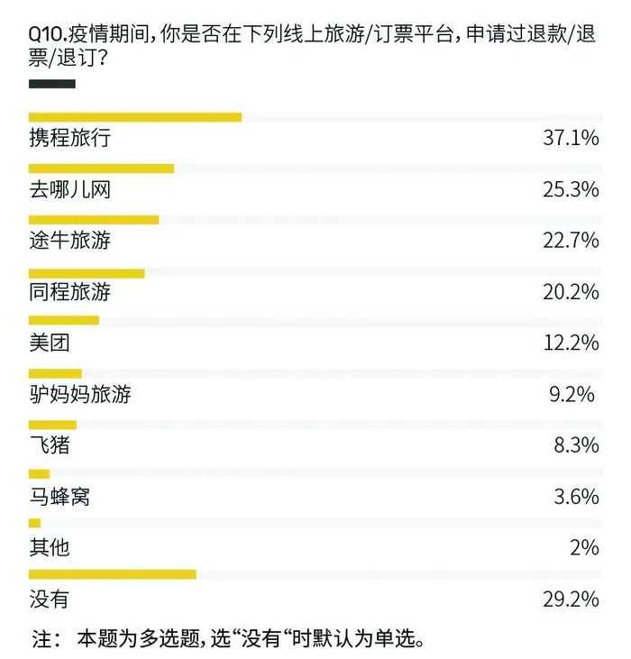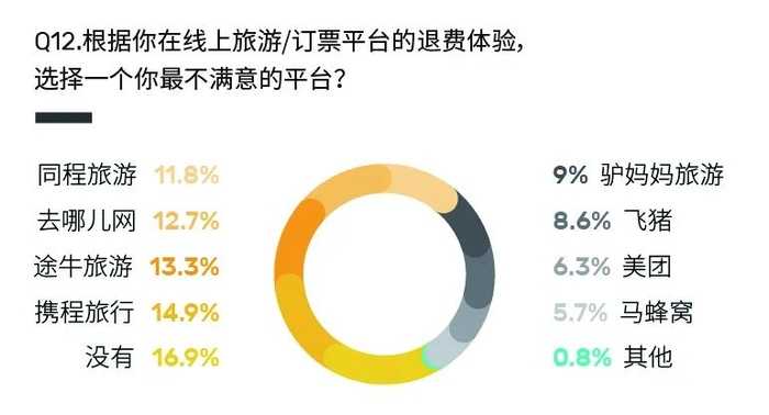 最终,综合疫情期间退费体验,在“最不满意平台”中,携程旅行(14.9%)被最多受访者提及,其次是途牛旅游(13.3%)、去哪儿网(12.7%)、同程旅游(11.8%)。整体上看各平台的提及率比较平均,也间接反映出各平台都存在影响用户体验的退费难题。
