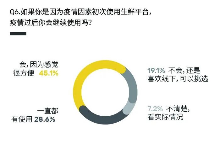 值得一提的是,将近一半受访者表示因为疫情而初次使用生鲜平台,并会在今后继续使用。连同勾选“一直都有使用生鲜平台“的人,超过七成受访者今后会使用生鲜平台。这将会是一个充满消费潜力的市场。