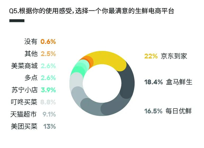 最终,综合疫情期间整体使用感受,在“最满意生鲜平台”中,京东到家(22%)获得最多受访者认同,其次是盒马鲜生(18.4%)。而通过使用情况(Q3)与满意度(Q5)的交叉分析,叮咚买菜、苏宁小店、美菜商城的用户满意度相对较低。