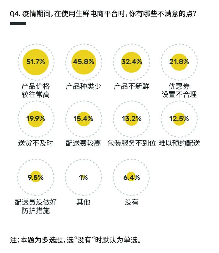 值得关注的是,超过九成受访者在使用上存在不满意的点。排在不满意项前三的均与产品直接相关。其中,51.7%认为“产品价格较往常高”,45.8%认为“产品种类少”,32.4%认为“产品不新鲜”。