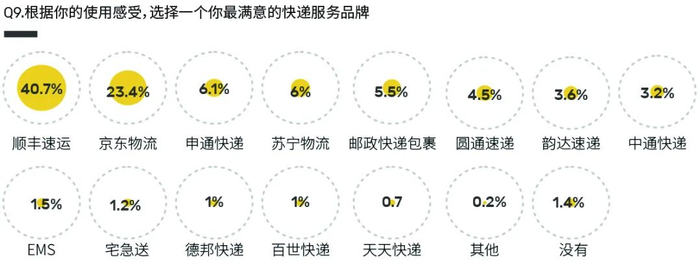 最终,综合疫情期间整体使用感受,在“最满意快递服务品牌”中,顺丰速运(40.7%)获得最多受访者认同,其次是京东物流(23.4%),它们的提及率均远高于其他品牌。而通过使用情况(Q7)与满意度(Q9)的交叉分析,德邦快递、宅急送、百世快递的用户满意度相对较低。