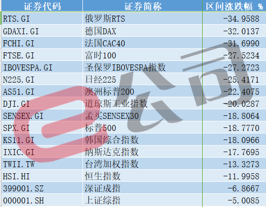 但自2月24日以来的三个星期内,道指下跌仍有5807点,跌幅为20%;纳斯达克指数下跌17.8%,标普500指数下跌18.8%,其他主要地区股指也不容乐观:俄罗斯RTS、德国DAX以及法国CAC40指数均下挫逾30%,亚太地区相对跌幅较小,日经225指数下跌25%,韩国综指下跌19%,而因疫情局势好转,A股已经走出此前的阴霾,相对来讲较为抗跌,深证成指和上证综指分别只跌了6.9%和5%。