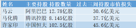 从部分公开持股信息来看,许家印因持有的中国恒大股价跌幅较大,以及持股比例较高的因素,三周内身价缩水约45.6亿美元,为市值损失之最;马化腾因腾讯控股损失约37亿美元;而阿里巴巴的股价上周下挫5.2%,相对较少,马云作为第二大股东,身价降幅也“仅”30.6亿美元。