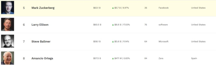 作为Facebook创始人,“少壮派”富豪的马克扎克伯格,是几大科技股中持股比例最高的个人持股者,拥有Facebook14.04%的股份。因此在过去三周内持股市值蒸发近160亿美元,以631亿美元的身价紧随巴菲特其后,排名全球第五。