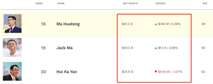 然而,在最新的福布斯实时富豪榜中,马云再度被反超,虽然周五因阿里股价大涨4.8%而“浮盈”11亿美元,但仍由“小马哥”以412亿美元的身价暂居中国首富,世界排名第18;而许家印则因周五恒大股价下跌2.71%,单日身价损失548万美元,位列全球富豪榜第30位。