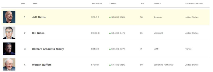 注:排行榜前十大富豪分别为亚马逊CEO杰夫·贝佐斯、微软创始人比尔盖茨、LVMH总裁伯纳德.阿诺特家族、“股神”沃伦·巴菲特、Facebook创始人兼CEO、甲骨文老板拉里·埃里森、微软公司前CEO史蒂夫鲍尔默、西班牙服装公司Inditex创始人阿曼西奥·奥特加、Google公司创始人拉里佩奇、墨西哥电信巨头卡洛斯·斯利姆·埃卢.