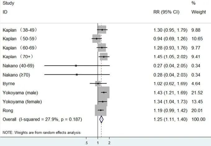 研究结果发现,与吃早餐的人相比,不吃早餐的人,其心血管病风险升高22%(RR=1.22,95%CI 1.1~1.35),全因死亡风险升高25%(RR=1.25,95%CI 1.11~1.4)。