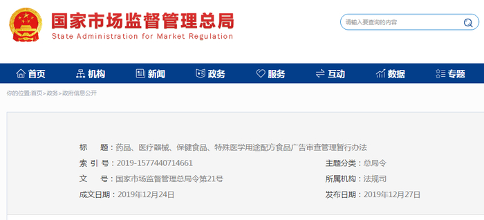 2019年12月13日经国家市场监督管理总局2019年第16次局务会议审议通过《药品、医疗器械、保健食品、特殊医学用途配方食品广告审查管理暂行办法》(以下简称《办法》)。《办法》自2020年3月1日起施行,明确规定未经审查不得发布药品、医疗器械、保健食品和特殊医学用途配方食品广告。