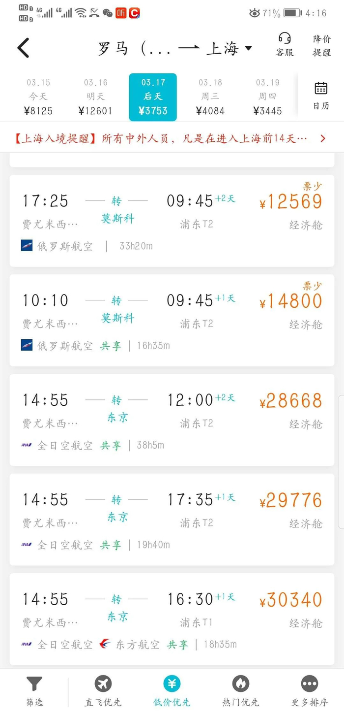 以确诊人数破万的意大利为例,3月17日从首都罗马飞上海,票价在一万至三万左右不等,其中多个班次显示“票少”。