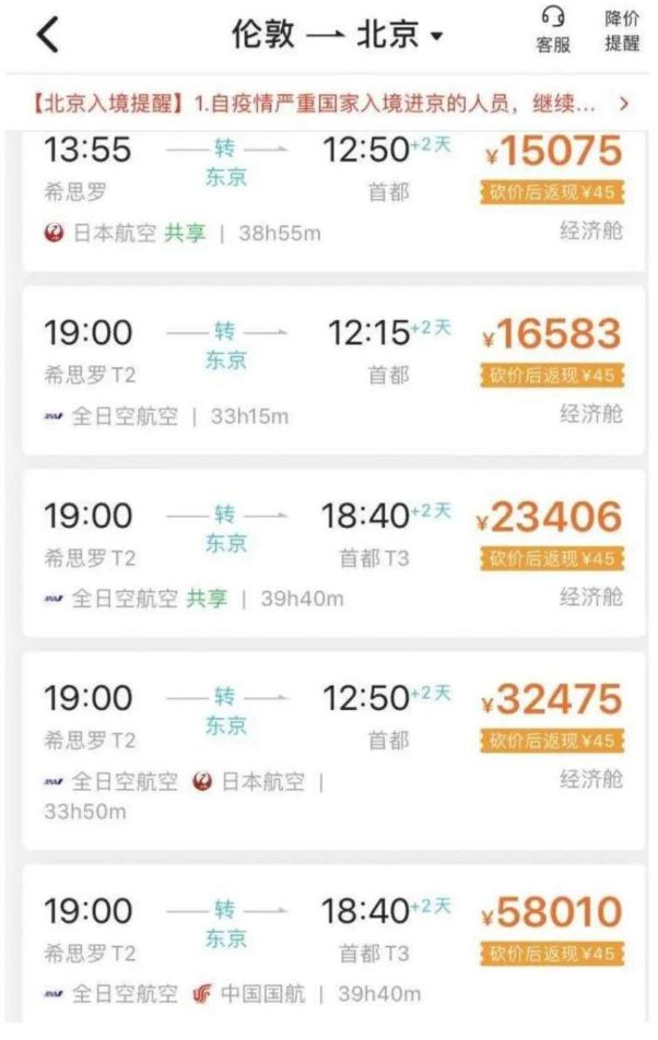记者打开某在线购票平台发现,3月16日,有5趟从伦敦飞往北京的航班机票在售,全部为中转。票价从15000元至60000元不等。
