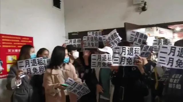 但实际上,免租事件背后也有一地鸡毛。比如,最近小巴看到网上流传出一些图片和视频,不少地方的购物中心上演了一次小游行,商户手举写着“2月免租、3月免租、4月减租”等字样的白纸,拉横幅、喊口号要求免租。
