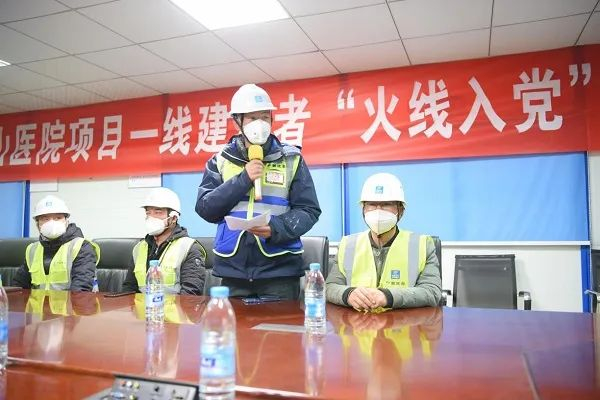 2月2日,中建三局火神山医院项目现场指挥部临时党委研究并报中建三局党委,同意金晖、潘吉建、张克强等8名同志“火线入党”。现场,金晖作为预备党员代表表态:“加入中国共产党是一份光荣,更是一份责任,我们愿同大家一道,不忘初心,不计回报,逆风而行。”工程建设争分夺秒,全员都投入在施工一线,入党仪式后,预备党员立刻回到各自岗位,为冲刺项目交付节点全力拼搏,终于保证医院如期交付投用。