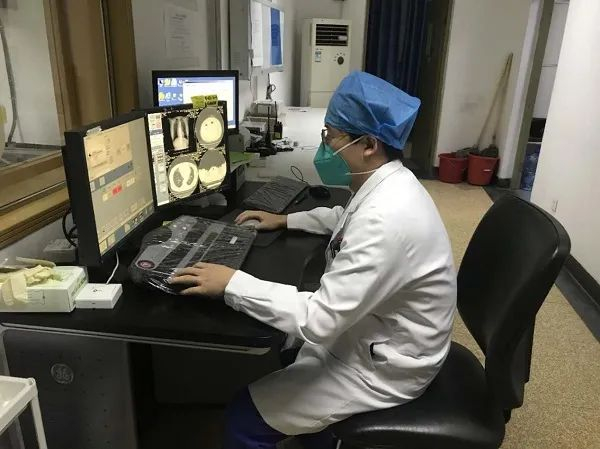 王坤在CT室给患者做肺CT检查