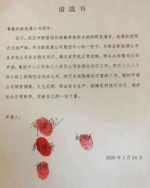 在这次“抗疫保电”的工作中,面对复杂严峻的疫情,罗浩然毫不犹豫放弃了春节假期,主动请缨,带领集控中心其他3名值班员,写下请战书,要求坚守在“抗疫保电”第一线。1月23日,武汉“封城”。1月24日,湖北省启动重大突发公共卫生事件一级应急响应。面对不断蔓延的疫情,公司面临着防疫和保电的双重压力,罗浩然所在的集控中心承担着公司19个投运风电场及光伏电站生产管理的中枢功能。“疫情就是命令,防控就是责任。”由于集控中心位于武汉徐东大街的湖北能源大厦,为避免换班及路途往返造成的感染风险,经公司同意,罗浩然调整值班安排,带领两名值班员24小时在集控中心值班。