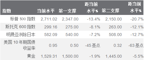 当前,波动率VIX(即恐慌指数)仍维持在60附近的高位。渣打(中国)财富管理部投资策略总监王昕杰对第一财经记者表示,市场仍存压力。标普500指数一度跌破关键支撑位2640(200周移动均线),不过从上周表现来看,最终并没有收在该位置下方。该位置往下的主要支撑位位于2018年低点2347点(比上周五收盘低了约13%)。标普500指数只有站稳2347点,才有望保持向上的中期技术形态。