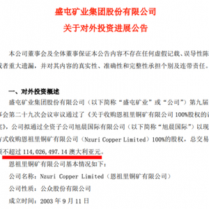 【TechWeb】近日,盛屯矿业子公司旭晨国际宣布:已完成恩祖里铜矿公司的100%的股权收购,交易金额约1.14亿澳元(约合5亿元人民币)。