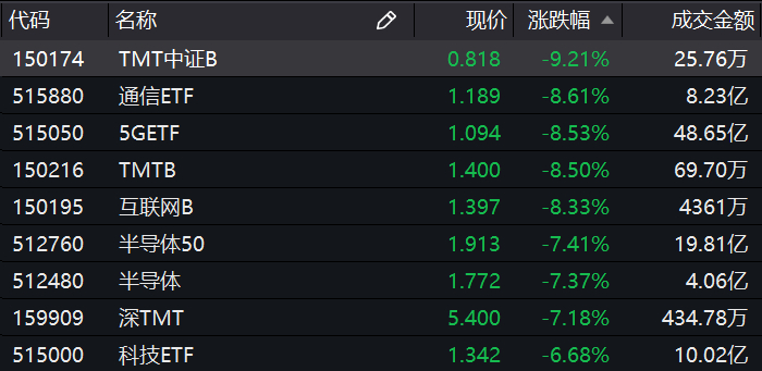 具体来看,通信ETF(515880.SH)、5GETF(515050.SH)跌超8%,半导体50(512760.SH)、半导体(512480.SH)跌超7%,科技ETF(515000.SH)跌幅也在6%以上。