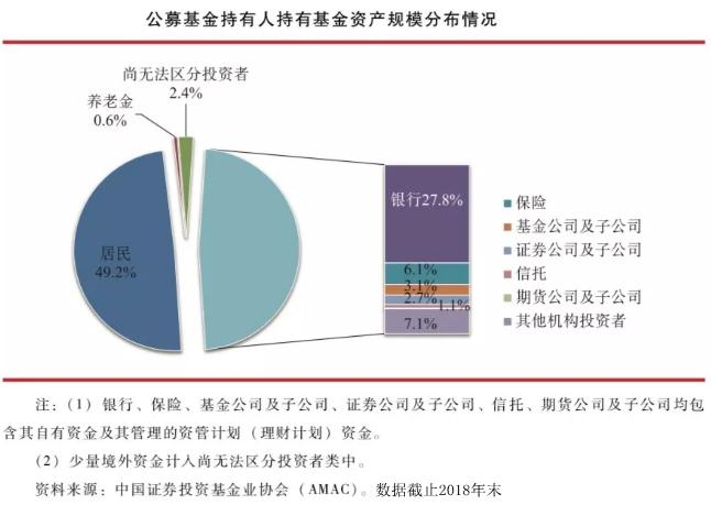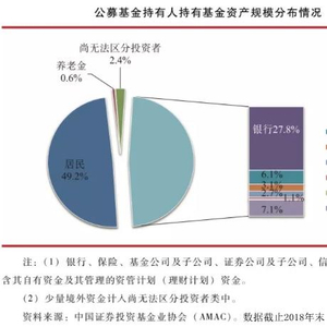相对投资单一股票而言,选择基金投资是属于风险分散更优的理财方式,若选择偏股型的基金,收入回报并不会比一般的股票低,因此,越来越多的家庭资产配置中基金投资比例逐渐上升。根据中国基金业协会《中国证券投资基金业2019年年报》中统计显示,从全部公募基金持有人结构来看,居民(个人)持有资产规模占比49.2%,略高于各类机构持有规模占比。在各类机构中,银行及其资管计划(理财计划)持有资产规模比例最高,占全部基金规模的27.8%,占各类机构持有规模的58.2%。