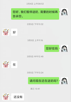记者于2月4日取消了原来一直在订购的三元牛奶,3月5日询问送奶人员是否正常送奶,得到的答复是没有。