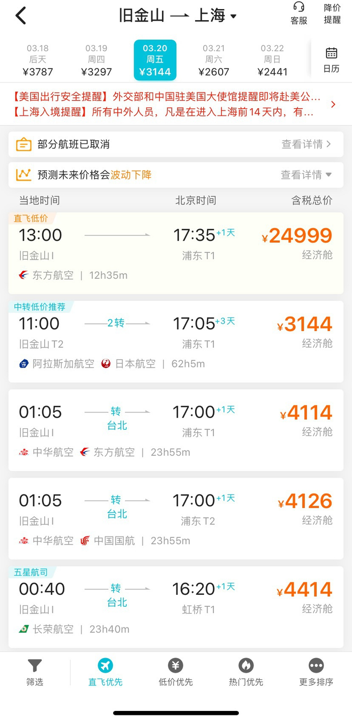 目前可查询到的,旧金山飞上海直飞航线最早在3月20日有一班东航执飞的航班,经济舱售价达到24999元。