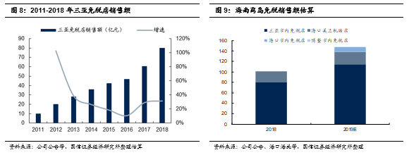 海口市内免税店借鉴:存量机场免税+三亚免税先发下,开业首年销售额仍有支撑。海口市内免税店2019年1月19日开业前,海南已经拥有海口美兰机场免税店以及三亚市内免税店,二者2018年分别贡献销售额21亿元、80亿元,与未来国人离境市内免税店落地时的情况有一定相似(机场免税已有多年发展)。但从2019年的情况来看,在初期供货相对不足,店面设计问题,与机场店经营协调等多因素共同影响下,海口市内免税店2019年预计仍实现销售额8-10亿元(经营仅11月+),同时海口美兰机场免税店预计同比稳定增长,这其中固然有2019Q4促销的因素,但从一个侧面可以看出国内市内免税店的潜力。虽然国人离境市内免税店下,国际航线也相比国内航线,有部分客流直接机场转机,不在市内购买,部分情形不完全可比,但客观而言,出境客流的平均购买力相对也不排除略高于海口离岛客流。并且,2019年随着海口、博鳌等市内免税店的落地,结合促销等活动,我们预计海南离岛免税销售额2019年整体有望实现40-50%较快增长。总体来看,我们认为海口市内免税店的运营实践可以为我国未来国人离境市内免税店收入规模估算提供参考。