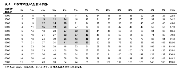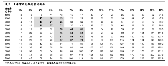 综合来看,结合我们2019年5月深度报告的分析估算,参考海口、三亚数据以及京沪枢纽机场免税数据,我们估算京沪市内免税店空间敏感性总空间如下,进而尝试估算国人离境市内免税店可能空间。