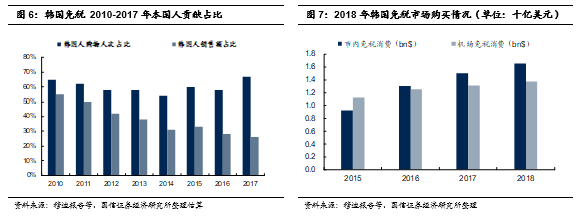 国际借鉴:国人离境市内免税店系消费回流的重要手段,且空间广阔。结合我们2019年9月《韩国市内免税40年启示录:牌照之上,规模永恒》等系列韩国免税深度专题的分析:1、作为全球第一的韩国免税市场,其8成销售额来自市内免税店渠道;2、虽然韩国近几年免税市场快速成长离不开中国居民的大量买买买,但从此前的情况来看,2010-2011年,韩国本国人对韩国免税业的销售额贡献均达到或超过50%,其中核心在于市内免税店渠道等的支持,市内免税渠道也成为韩国回流本国居民海外消费的重要手段之一;3、2010-2017年,从购物人次的角度,韩国本国人的免税购物人次贡献也是超过50%;4、近几年,韩国本国人在其市内免税店的购买基本略高于机场免税店,可见市内免税渠道的优势:购物时间充裕灵活,且品牌SKU可以更加丰富等。