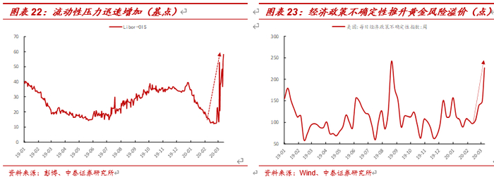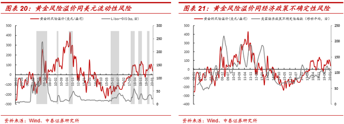 但在趋势的背后,不容忽视的是流动性等问题带来的波动。我们将实际收益率预期决定的黄金价格收益性的趋势项(图表20)扣除后,可以清晰看到,Libor-OIS代指的流动性风险波动影响黄金价格短期波动,美国经济政策的不确定指数影响黄金中长期的避险需求。甚至在一定阶段,流动性问题对金价的影响“特别显著”,如图表18所示,2011年8月份-2012年6月份金价和实际收益率的不完全拟合便是如此——欧债危机持续发酵,黄金资产充当了兑换美元流动性的角色,或与现在作为避险资产黄金出现下跌类似。