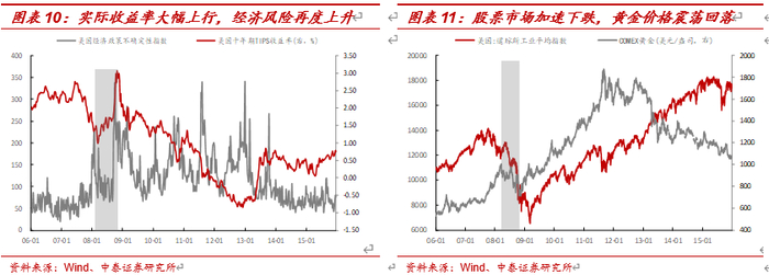 第二阶段:流动性危机快速加剧(即流动性危机第二阶段),并向实体经济传导。伴随着雷曼兄弟破产、美银收购美林以及华盛顿互助银行破产,流动性风险加剧,并逐步向实体经济扩散,2008年7月至2008年11月,美国新增非农就业人数与非制造业PMI大幅回落,偏离其正常波动区间,为对冲危机对实体经济的冲击,美联储继续降息至零利率附近,但仍未能阻止通缩预期的加剧(实际收益率快速上升)。在危机的第二阶段,实体经济表现为,油价快速回落背景下,通缩预期快速升温,经济失速下滑,金融市场表现为股票市场快速下跌,黄金虽有避险属性支撑,但通缩预期快速增强,金价震荡回落。