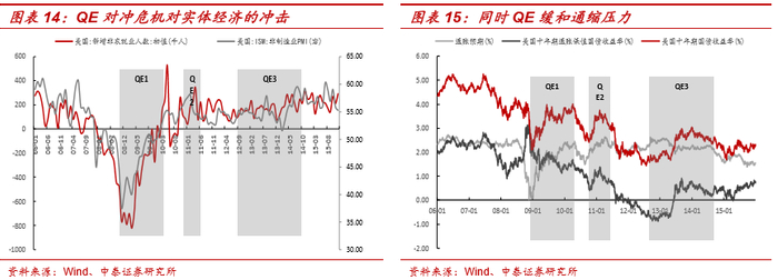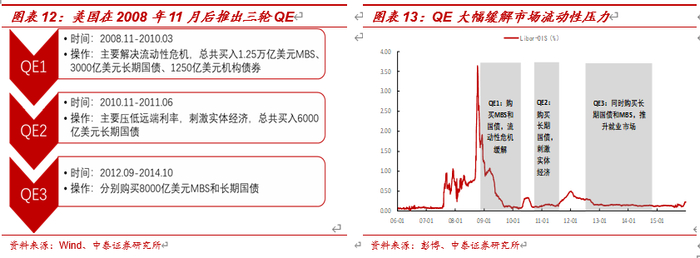 第一轮QE主要解决短期的流动性问题,2008年11月-2010年3月共买入1.725万亿美元资产,包括MBS、国债及机构债券;第二轮QE通过购买长期国债压低远端利率,实现对经济的刺激作用,2010年11月-2011年6月总计买入6000亿美元长期国债;第三轮QE同时购买MBS和国债,主要为了提升就业,2012年9月-2014年10月,共买入1.6万亿美元资产,包括MBS和长期国债。