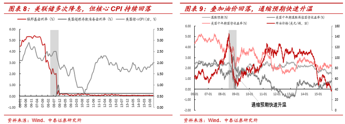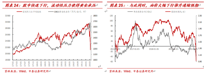2)流动性风险再次爆发并加剧,进而向实体经济传导,经济失速下行同时叠加油价回落,通缩预期升温并强于避险溢价,实际收益率上行,金价震荡下行;