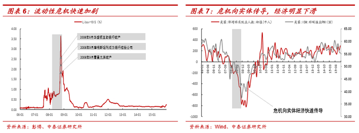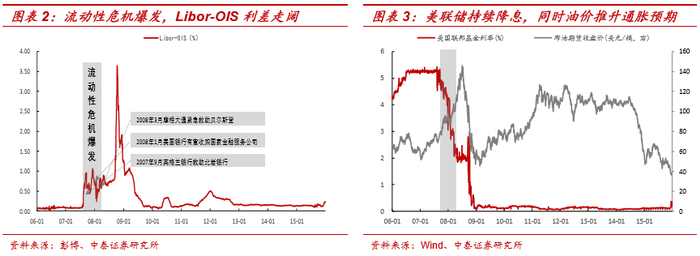第一阶段:流动性危机爆发(即流动性危机第一阶段)。伴随着利率的抬升,越来越多的次级贷款人偿还压力增大,次贷偿还推迟,违约率大幅提升,而拥有大量次贷风险敞口的机构面临破产和赎回风险,其中不少机构又是通过期限错配的方式提高收益率,伴随着次贷违约率的提升,流动性风险快速升温,我们用Libor-OIS衡量美元流动性变动,在2007年8月份开始Libor-OIS从底部快速上升,流动性危机开始爆发。在危机的第一阶段,金融市场表现为股票市场初现疲态,黄金在避险属性,以及实际利率下行背景下,快速走高。