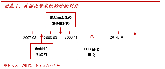 根据美国次贷危机的演变过程,我们将其分为以下三个阶段:流动性危机爆发(2007.08-2008.03)→风险向实体经济快速扩散(2008.03-2008.11)→美联储量化宽松(2008.11-2014.10)