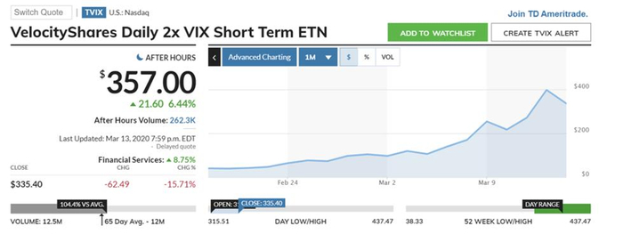 因为美股闪崩、波动率飙升,瑞信(Credit Suisse)旗下Velocity Shares Daily Inverse VIX Short-Term ETN(代号XIV)周一收市下跌14%,后跌幅急速扩大至逾80%,暴跌。15亿市值,七年中翻了15倍,但只要一天时间,灰飞烟灭!