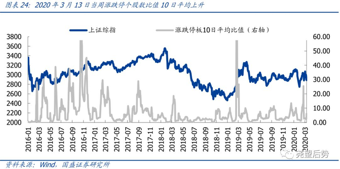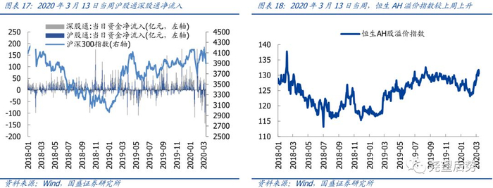 换手率和涨跌停个股数比值可以间接反映市场的活跃度和风险偏好情况。2020年3月13日当周A股的周度换手率为8.55%,较上期有所回落;涨跌停个股数比值由上期的2.92上升至6.13。