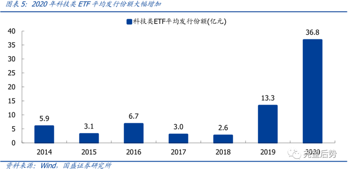 2019年下半年以来,科技类基金发行明显放量,季度平均发行规模达到8只,同时值得注意的是,科技类ETF平均发行规模也出现了大幅增长,2014年至2018年,科技类ETF平均发行规模不足5亿,2019年科技类ETF平均发行规模达到13.3亿元,2020年以来,科技类ETF的平均发行规模更是快速增长至36.8亿元。
