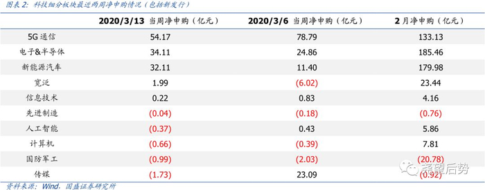 从科技类ETF的细分板块来看,5G通信、电子半导体以及新能源汽车板块资金仍在持续流入,3月6日当周的净申购分别为78.8亿元、24.9亿元和11.4亿元,3月13日的净申购分别为54.2亿元、34.11亿元、32.1亿元。
