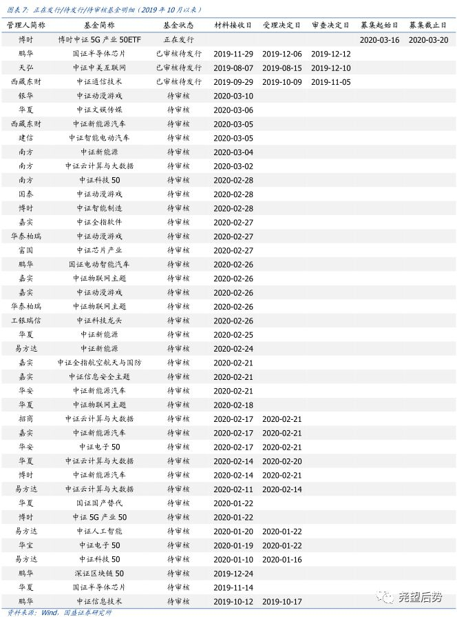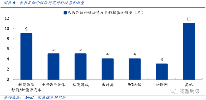 当前仍有41只科技类ETF等待发行,其中1只正在发行(博时中证5G产业50ETF),3只已经通过审核等待发行,37只等待审核。从细分板块来看,新能源及智能/新能源汽车ETF有9只,电子半导体ETF和动漫游戏ETF各5只,云计算ETF和5G通信ETF各4只,物联网ETF有3只,其他科技板块ETF有11只。